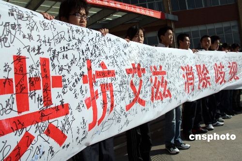 2008年11月28日上午,山東濱州學院大學生舉著印有“攜手同行,共抗艾滋,消除歧視,共享健康”的條幅。當日,在世界艾滋病日來臨前夕,濱州紅十字會與濱州學院聯(lián)合舉辦了此次簽名活動,吸引了學院萬余名大學生熱情參與。中新社發(fā) 郭志華 攝