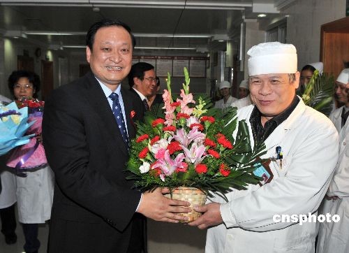12月1日,衛(wèi)生部副部長、國家中醫(yī)藥管理局局長王國強(qiáng)(左),在廣西南寧市第四人民醫(yī)院為從事治療艾滋病的醫(yī)生獻(xiàn)花。12月1日是第21個(gè)世界艾滋病日,王國強(qiáng)代表衛(wèi)生部慰問長期從事艾滋病治療工作的醫(yī)護(hù)人員并看望艾滋病患者。中新社發(fā) 曾利明 攝