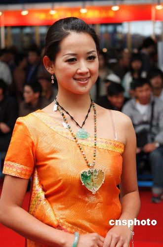 圖為身著盛裝的傣族少女展示一款玉石項(xiàng)鏈。