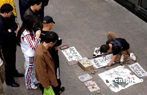 12月4日,左手小臂以下被截肢,右臂高位截肢的廣西男子劉國強,在福州鬧市街頭口含毛筆作畫掙錢。2002年,劉國強在農村家里打谷發(fā)生意外導致雙手截肢,之后他開始口銜毛筆寫字作畫掙錢謀生。中新社發(fā) 王東明 攝