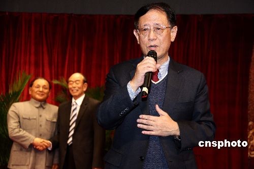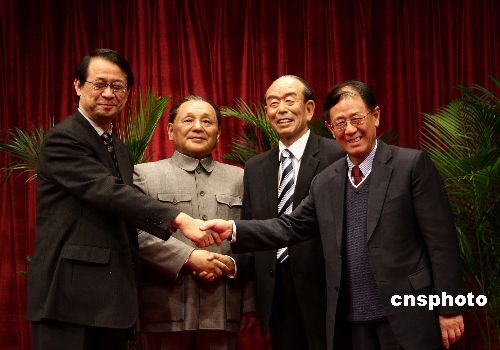 12月5日,中國(guó)人民和平外交促進(jìn)會(huì)、炎黃子孫熱愛(ài)祖國(guó)聯(lián)合會(huì)、中國(guó)偉人蠟像館等,在北京人民廣播電臺(tái)大廈啟動(dòng)“平福中日,世代之約”活動(dòng)。中國(guó)人民和平外交促進(jìn)會(huì)會(huì)長(zhǎng)胡德平、日本國(guó)大使館公使泉裕泰參加了活動(dòng);顒(dòng)儀式上,中國(guó)人民向日本人民贈(zèng)送了一份特殊意義的禮物——以蠟像藝術(shù)形式再現(xiàn)30年前鄧小平和福田赳夫簽訂“中日和平友好條約”的歷史時(shí)刻。中新社發(fā) 張愛(ài)東 攝