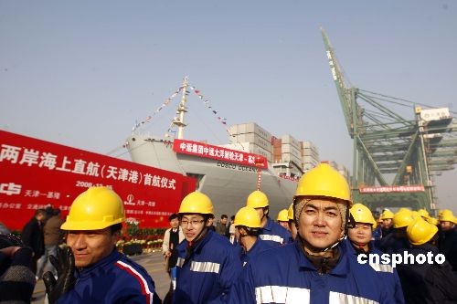 12月15日,海峽兩岸海上直航首航儀式在天津市天津港舉行。據悉,當日舉行首航儀式的,大陸有天津、上海、太倉、福州、廈門、泉州6個港口,臺灣有基隆、高雄2個港口,參加首航的船公司13家,其中大陸9家公司15艘船舶,臺灣4家公司5艘船舶。中新社發(fā) 盛佳鵬 攝