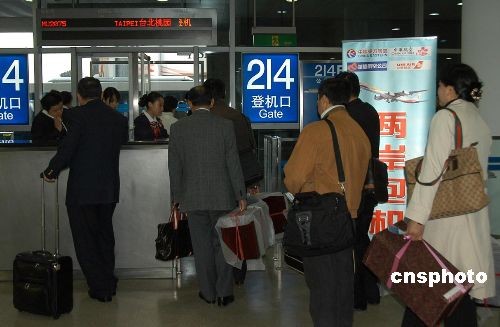 12月15日上午,中國東方航空公司MU2075航班搭載著150名旅客,從上海浦東國際機場順利起飛前往臺灣桃園機場,拉開大陸航空公司經(jīng)“截彎取直”的新航路前往臺灣的常態(tài)客運包機序幕。圖為首航航班旅客辦理登機手續(xù)。中新社發(fā) 張明 攝