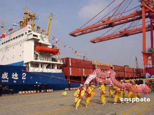 12月15日上午,廈門港4艘集裝箱貨輪“盛達(dá)2”輪、“錦春”輪、“曉江”輪、“華航1”輪,在人們的喝彩聲中緩緩啟航,直航高雄港、臺(tái)中港、基隆港。從1997年4月開(kāi)始獲準(zhǔn)開(kāi)通對(duì)臺(tái)“試點(diǎn)直航”、積累了10多年對(duì)臺(tái)航運(yùn)經(jīng)驗(yàn)的廈門港從此升級(jí)。中新社發(fā) 楊伏山 攝