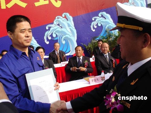 圖為廈門海事局官員為參與首航的“華航1”輪船長(zhǎng)頒發(fā)出港許可證。