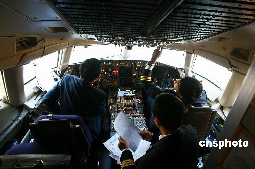 圖為起飛前,機(jī)組人員在駕駛艙內(nèi)精心進(jìn)行航前準(zhǔn)備。