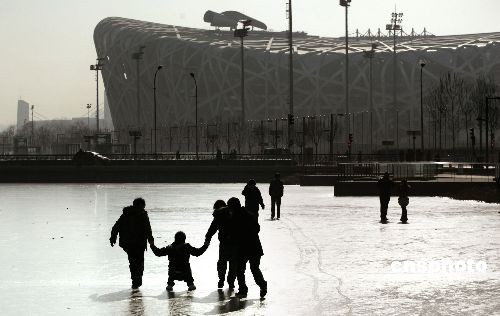 十二月中旬,北京“鳥巢”外的景觀湖已經封凍,民眾在冰面上快樂嬉戲。中新社發(fā) 廖攀 攝