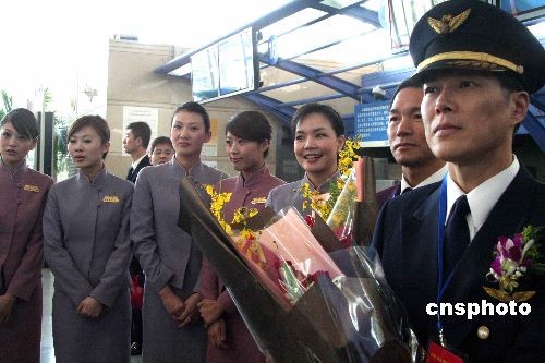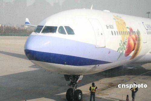 臺灣地區(qū)中華航空的CI七九八九越過海峽,于十二月十五日十點十分飛抵浙江杭州蕭山機場。機身上印著臺灣的水果。中新社發(fā) 汪恩民 攝