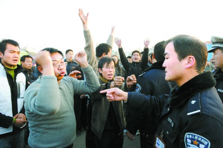 雙方中間,則有20多名民警維持秩序,不時地將撕扯的雙方拉開,場面一度十分混亂。