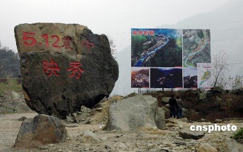 “5·12”8級(jí)大地震震中汶川縣映秀鎮(zhèn)山體滑坡滾下一塊巨石,有關(guān)部門在巨石上刻字作為地震遺物保護(hù),圖右是未來映秀鎮(zhèn)未來的規(guī)劃圖。嚴(yán)冬時(shí)節(jié),過往行人紛紛留步此間駐足觀看映秀的過去和將來。中新社發(fā) 肖龍聯(lián) 攝