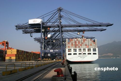 十二月十九日,深圳鹽田國際集裝箱碼頭首次迎來兩岸大三通后的直航集裝箱船舶──“中遠大洋州”號,它在十八日駛離臺灣高雄港后,經(jīng)過十四小時的航行抵達鹽田!爸羞h太平洋”號運載力為一萬二十標箱,在鹽田靠泊約八小時。鹽田是兩岸七十四個直航港口之一。中新社發(fā) 方衛(wèi) 攝
