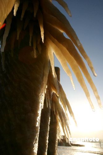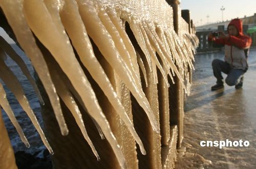 連云港海岸邊護(hù)欄上海水凍結(jié)成晶瑩剔透的冰凌。