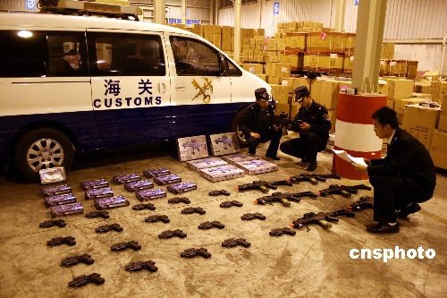 近日,寧波海關(guān)在貨運(yùn)渠道查獲512支國(guó)家禁止進(jìn)出境仿真槍,目前該批仿真武器已移交有關(guān)部門(mén)處理。據(jù)了解,該批仿真槍外殼為黑色硬塑料,部分內(nèi)部機(jī)件為金屬制,槍支彈匣、瞄準(zhǔn)器、消音器、紅外鐳射燈、BB彈等配件一應(yīng)俱全。中新社發(fā) 何蔣勇 攝