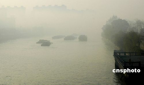 12月25日早上6時56分,杭州市氣象臺發(fā)布大霧黃色氣象預警,從早上7時起,濱江區(qū)、錢塘江兩岸及部分城區(qū)出現(xiàn)能見度小于500米的濃霧,對交通出行帶來一定影響。圖為在京杭大運河杭州段,濃霧中列隊通行的船只。中新社發(fā) 金斌 攝