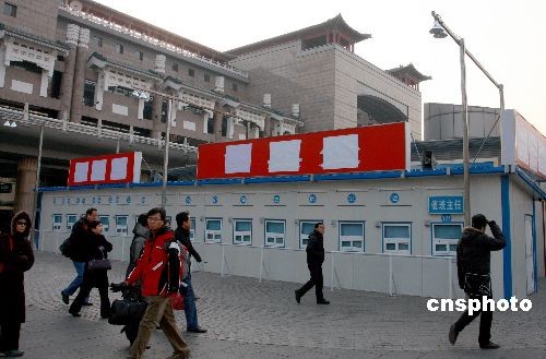 12月26日,北京西站廣場(chǎng)上搭建起“臨時(shí)售票窗口”,為2009年春運(yùn)做準(zhǔn)備。2009年春運(yùn)將從元月11日至明年2月19日結(jié)束,為期40天。今年春運(yùn)的特點(diǎn)是學(xué)生流和民工流探親流三流重疊,春運(yùn)壓力空前集中。針對(duì)近日來迅猛增長的節(jié)前客流,為方便旅客購票,春運(yùn)期間北京站和西站會(huì)將在站前廣場(chǎng)開辟臨時(shí)售票窗口,方便旅客購票。中新社發(fā) 鄭雄增 攝