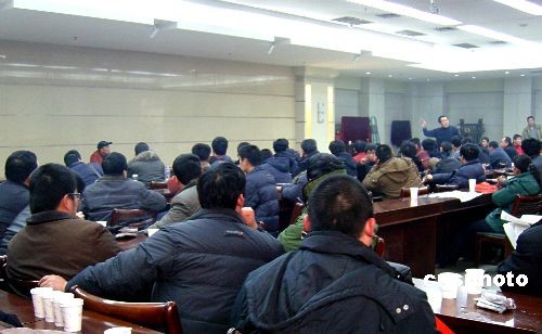 12月26日下午3時許,三鹿液態(tài)奶山東經(jīng)銷商聚集石家莊市三鹿集團總部討要貨款,在得知此次石家莊市政府新出臺的還款方案并未涉及山東液態(tài)奶經(jīng)銷商后,百余經(jīng)銷商情急之下登至三鹿集團五層高的辦公樓樓頂,直至當?shù)靥鼐鰟,將?jīng)銷商們勸下樓頂,事態(tài)才得以控制,整個過程持續(xù)近一小時。圖為山東經(jīng)銷商被請進會議室后,與三鹿集團有關(guān)負責人就還款事宜進行協(xié)商。中新社發(fā) 牛琳 攝