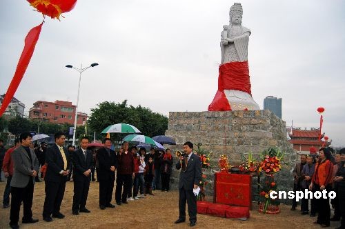 十二月二十七日,臺(tái)灣鹿港天后宮敬贈(zèng)媽祖神像揭彩儀式在福建泉州霞洲媽祖宮舉行。由臺(tái)灣鹿港天后宮專門敬贈(zèng)的一尊高五米、底座三米的媽祖神像,放置在霞洲媽祖宮外,供善男信女朝拜。霞洲媽祖宮迄今有近四百年的歷史,在政府撥款三百七十萬元人民幣重建媽祖宮的過程中,得到了眾多海外僑胞特別是臺(tái)灣同胞的慷慨解囊。中新社發(fā) 傅丹丹 攝