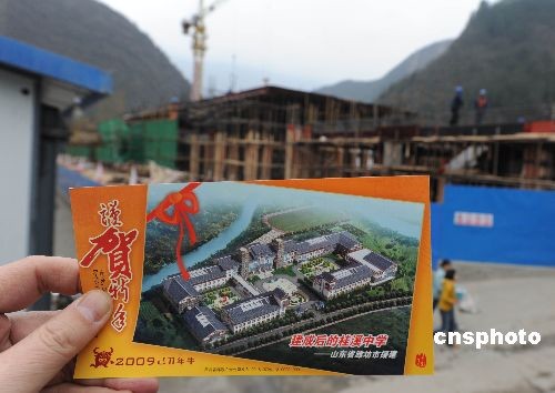 胡總書記12月27日到北川縣桂溪中學(xué)考察看望時(shí),一位羌族女學(xué)生向臨告別時(shí)的總書記送上一封信和這張學(xué)校震后重建規(guī)劃圖的賀年片。圖為羌族學(xué)生展示送給胡總書記的賀年片。中新社發(fā) 賈國榮 攝