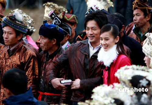 1月7日,在廣西融水苗族自治縣四榮鄉(xiāng)田頭苗寨,知名藝人黃圣依、蘇有朋在拍戲中。近日,《尋找劉三姐》電影劇組來到廣西融水縣田頭苗寨拍攝外景戲,黃圣依和蘇有亦現(xiàn)身大苗山,出演劇中主要人物。據(jù)了解,電影《尋找劉三姐》由廣西電影制片廠等單位聯(lián)合出品,由黃圣依、蘇有朋主演。中新社發(fā) 龍濤 攝