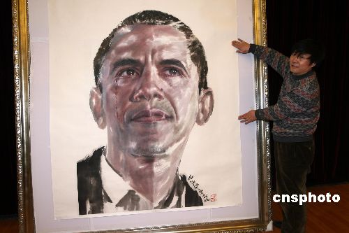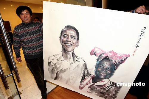 1月20日,中國著名畫家于成松大型中國畫《朗朗青空》在北京與觀眾見面。作品以奧巴馬為原型,圖中奧巴馬面掛激動的淚花,頭微微仰望遠方。于成松說,想通過創(chuàng)作該幅作品,加深中美兩國人民的了解和友誼。畫家同時創(chuàng)作了以奧巴馬和他的肯尼亞奶奶為原型的作品《盈盈厚土》。中新社發(fā) 杜洋 攝