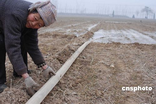 2009年2月4日,山西小麥產(chǎn)地運城新絳縣農(nóng)民在全力以赴進行抗旱工作。入冬后,山西省受旱面積達3274萬畝,其中山西小麥主產(chǎn)區(qū)運城、臨汾兩地農(nóng)作物受旱面積達634萬畝,同時有106萬群眾及19萬頭牲畜出現(xiàn)飲水難問題。2月3日,山西省政府防汛抗旱指揮部已發(fā)布干旱橙色預(yù)警(Ⅱ級)并啟動響應(yīng)行動。山西省財政緊急下?lián)芸购蒂Y金1000萬元。中新社發(fā) 高新生 攝