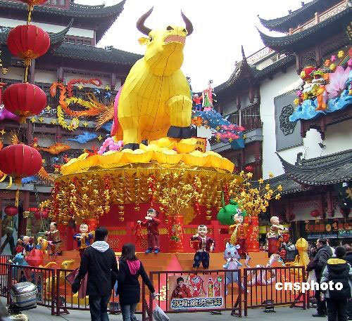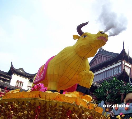 2009年2月6日,一個長7米、高3米的巨型“牛燈”在上海豫園元宵燈會上閃亮登場!芭簟钡谋强走會冒煙,以應和“牛氣沖天”的寓意。中新社發(fā) 井韋 攝