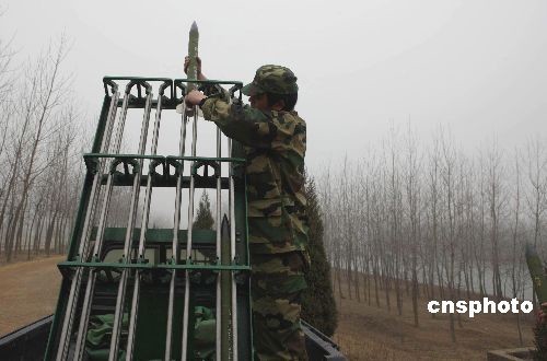 中國許多地方正在遭受嚴(yán)重干旱,各地抓住氣象條件動(dòng)用人工增雨等辦法以緩解旱情。二月七日下午,安徽省出現(xiàn)有利增雨作業(yè)的天氣過程,十六時(shí)許作業(yè)飛機(jī)在蚌埠機(jī)場穿云破霧實(shí)施今年首次飛機(jī)增雨作業(yè)。八日八時(shí)、十時(shí)、十四時(shí),人工增雨作業(yè)飛機(jī)又連續(xù)三次先后在阜陽、六安、淮北、亳州、淮南、宿州、蚌埠等皖北地區(qū)作業(yè)。同時(shí),安徽旱區(qū)六市十四個(gè)縣和兩個(gè)區(qū)開展了次地面人工增雨作業(yè)。據(jù)統(tǒng)計(jì),七日下午至八日十六時(shí),安徽省已經(jīng)在干旱嚴(yán)重的皖北地區(qū)實(shí)施四駕次飛機(jī)人工增雨作業(yè),一百多次高炮火箭作業(yè),增雨面積達(dá)十萬平方公里,旱區(qū)普降三毫米以上甘霖,最大降雨量八點(diǎn)五毫米。圖為火箭人工增雨作業(yè)現(xiàn)場。中新社發(fā) 王兵 攝