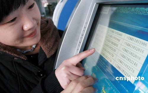2月21日,中國移動3G手機“188”號段放號進入第二天,北京市民在營業(yè)廳內(nèi)的自動終端前挑選自己滿意的手機號碼。2月20日起北京移動正式對188號段進行放號,188號段SIM卡是特別針對3G終端,只能在移動3G終端上使用,北京的手機用戶開始進入了3G時代。中新社發(fā) 鄭雄增 攝