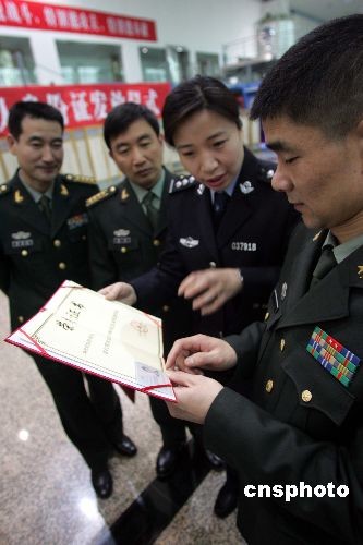 二月二十三日,北京海淀警方人口處警員來到中國(guó)航天員科研訓(xùn)練中心,為航天英雄、中國(guó)航天員科研訓(xùn)練中心副主任楊利偉、神七航天英雄翟志剛、英雄航天員劉伯明、景海鵬及其他航天員代表頒發(fā)居民身份證。中新社發(fā) 韓峻巍 攝