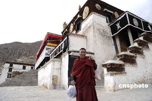 2月24日,藏歷年三十,拉薩哲蚌寺內一位喇嘛背著大包年貨進入佛殿。中新社發(fā) 廖攀 攝