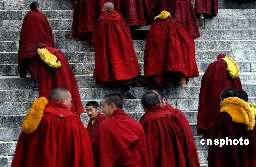 3月4日,中國(guó)藏歷新年正月初八,西藏拉薩哲蚌寺舉行傳昭大法會(huì),該寺僧人辯經(jīng)結(jié)束后進(jìn)入措欽大殿。中新社發(fā) 廖攀 攝