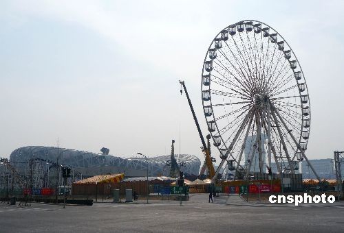 2009年3月10日,在北京奧林匹克公園“鳥巢”東北角,摩天輪、海盜船、太陽(yáng)神車等在內(nèi)的娛樂設(shè)施已經(jīng)搭建完畢,目前正在加緊調(diào)試中,預(yù)計(jì)將于本月中旬開業(yè)迎客。據(jù)悉,此次嘉年華不同于前幾年舉辦的環(huán)球嘉年華活動(dòng),包括包括海盜船等在內(nèi)的40個(gè)機(jī)動(dòng)游樂項(xiàng)目和56個(gè)競(jìng)技游樂項(xiàng)目會(huì)給游客耳目一新的感覺,而且隨著季節(jié)的更替和游客喜愛程度的不同,這些大型游樂設(shè)施會(huì)定期替換。中新社發(fā) 玉龍 攝
