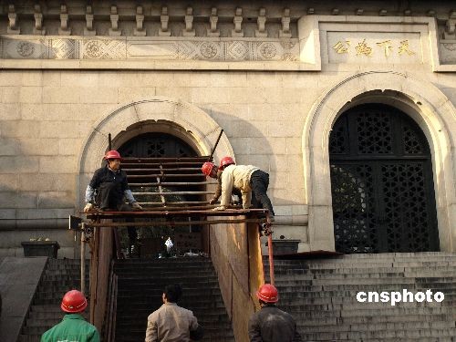 據(jù)南京市中山陵園管理局消息,為迎接孫中山奉安大典80周年,南京市近日投資300多萬元啟動中山陵主體建筑維修工程。據(jù)了解,這也是自新中國成立近60年來,中山陵第二次大規(guī)模維修,上次規(guī)模較大的維修是在1982年!拔崴乐,可葬于紫金山麓,因南京為臨時政府所在地,所以不忘辛亥革命也。”遵照孫中山先生的遺愿,中山陵于1926年春開始修建,至1929年建成,當(dāng)年6月1日,中山先生的靈柩奉安于此。 中新社發(fā) 楊潔 攝