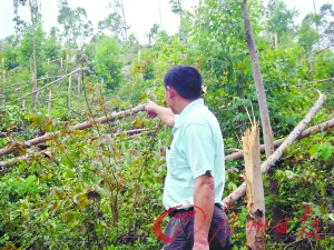 “半夜聽到呼呼的風(fēng)聲,隱約看到有白影在移動,接著冰雹就砸下來了。”當(dāng)夜正在值守的中興村村委會書記馮文安回憶道。昨日凌晨2時50分至3時10分,一股強(qiáng)勁的龍卷風(fēng)在臨田村北部的山林出現(xiàn),從臨田村村邊的水田和果林掠過。