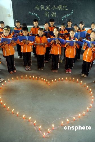 4月29日,河南省濟(jì)源市紙坊小學(xué)學(xué)生點(diǎn)燃紅蠟燭為四川地震災(zāi)區(qū)小朋友祈福。在汶川地震一周年即將來臨之際,河南省濟(jì)源市紙坊小學(xué)舉行“為災(zāi)區(qū)小朋友祈福”主題班會(huì),大家點(diǎn)燃紅蠟燭,獻(xiàn)上飽含深情的詩歌,為四川地震災(zāi)區(qū)小朋友祈福平安。中新社發(fā) 平白 攝