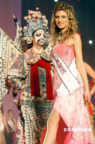 3月25日晚,身著盛裝的國際旅游小姐同中國傳統(tǒng)臉譜在河南鄭州同臺(tái)獻(xiàn)藝。當(dāng)晚,2008國際旅游小姐冠軍總決賽最佳晚裝小姐單項(xiàng)賽在河南鄭州舉行,來自115個(gè)國家和地區(qū)的佳麗參加了角逐。中新社發(fā) 慎重 攝