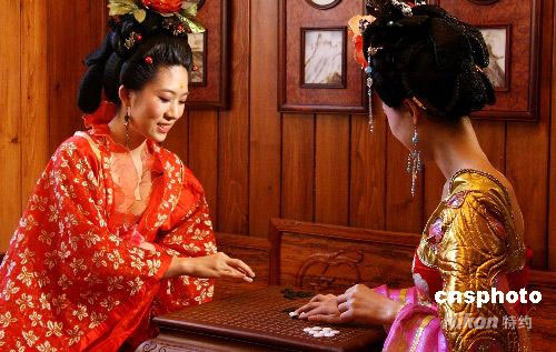 “國慶黃金周”之際,2008世界亞裔小姐大賽系列活動(dòng)在北京進(jìn)行展示,賽事活動(dòng)以中國文化和中國元素為表現(xiàn)主題,演繹“唐風(fēng)宋雅”女性風(fēng)采,通過展示中國盛唐時(shí)期的服飾美和造型美,從一個(gè)側(cè)面反映中國女性“浸于史、潤于知、融于德、成于韻”的獨(dú)特氣質(zhì)與內(nèi)涵,選手盛裝出境,在中國古典家具的映襯下,分別從琴、棋、書、畫四個(gè)方面完美演繹了一幅幅頗具文化氣息的傳統(tǒng)仕女生活圖。中新社發(fā) 錢興強(qiáng) 攝