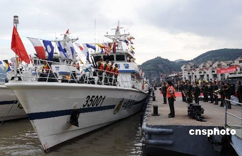 6月26日下午,全程參加上海世博會海上安保演練的海警35001艇及官兵載譽返回福建省公安邊防總隊海警一支隊亭江駐地。據(jù)了解,公安海警上海世博會海上安保演練6月21日在上海浦東新區(qū)蘆潮港海域成功舉行,來自全國9個公安邊防總隊的29艘公安海警艦艇、1000多名官兵及上海市公安局的兩架直升飛機(jī)參加演練。福建省公安海警部隊三艘艦艇及官兵參加了全程演練并受到嘉獎。中新社發(fā) 劉可耕 攝