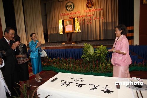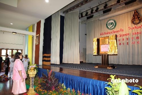六月十二日的泰國吉拉達學(xué)校古老校園里洋溢著濃郁的中國文化氣息。在喧天的鑼鼓聲中,泰國瑪哈扎克里·詩琳通公主殿下按動電鈕,寫有“吉拉達學(xué)校孔子課堂”的牌匾徐徐拉開帷幕,標志著泰國第七家孔子課堂正式落戶這個坐落于泰國王宮里的學(xué)校。揭牌儀式上,詩琳通公主還興致勃勃地重酌墨水,揮毫為孔子課堂題寫了“學(xué)無止境 ”四個漢字,并勉勵泰國各孔子學(xué)院、孔子課堂擔(dān)當(dāng)起推動泰國漢語教學(xué)進步、促進中泰友好關(guān)系發(fā)展的重任。中新社發(fā) 顧時宏 攝