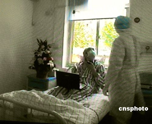 五月十三日中午,在山東省城濟(jì)南市傳染病醫(yī)院接受治療的輸入性甲型H1N1流感疑似患者呂某某目前身體、精神各情況已基本恢復(fù)。疑似患者呂某某在十一日晚剛從濟(jì)南火車站下車時(shí)體溫一度高達(dá)三十八點(diǎn)九攝氏度。經(jīng)過濟(jì)南市傳染病醫(yī)院的醫(yī)護(hù)治療,體溫已降至三十六點(diǎn)七攝氏度。圖為記者從醫(yī)院監(jiān)控系統(tǒng)的電視屏幕上拍到的患者正在與醫(yī)生交談。中新社發(fā) 張璐 攝