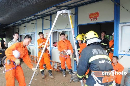 6月4日23時(shí)許發(fā)生的三亞繞城高速公路迎賓隧道塌方事故救援工作6日繼續(xù)進(jìn)行。截止6日上午9點(diǎn)半,8名被困施工人員尚無(wú)人員救出。三亞市交通局副局長(zhǎng)崔海龍上午介紹說(shuō),在原有救援方案繼續(xù)進(jìn)行的同時(shí),目前新增了兩套救援方案。一是從隧道上方新增一處選址鉆孔到隧道內(nèi),安插一個(gè)管道,為被困人員送水、送風(fēng)、送食物、喊話“送信心”。目前這一方案正在進(jìn)行中,但進(jìn)度較慢。二是從塌方處由外向里挖“貓洞”作為救生通道,用鋼板制作一個(gè)三角形的通道,能容納一個(gè)人進(jìn)出,通向被困人員。圖為三亞消防官兵在調(diào)試救援設(shè)備。中新社發(fā) 胡劍兵 攝