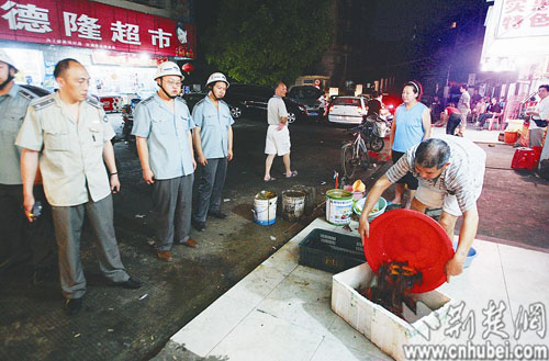 8時(shí)許,記者隨洪山區(qū)執(zhí)法隊(duì)來(lái)到圖書城路,遠(yuǎn)遠(yuǎn)便看到幾處燒烤攤上空煙霧繚繞、氣味嗆鼻,一家油燜大蝦店外,五六張餐桌橫亙?cè)谌诵械郎希郎衔r殼堆成小山,桌下污水橫流。“老板,你這樣出店占道經(jīng)營(yíng)違反了市容管理規(guī)定,請(qǐng)你配合一下,把桌子收到店里去吧!薄斑M(jìn)去哪有生意做?”勸說(shuō)、宣傳無(wú)效,50名執(zhí)法隊(duì)員圍站成一圈,雙手背在身后,沉默地注視著食客和坐在一旁的老板。如此“對(duì)峙”了27分鐘后,兩桌食客先“頂”不住了,草草結(jié)賬離去,老板與另兩桌食客又“堅(jiān)持”了片刻,最終悻悻地收拾起桌椅搬進(jìn)了店內(nèi)。