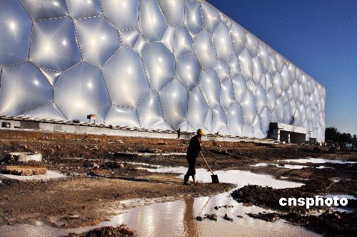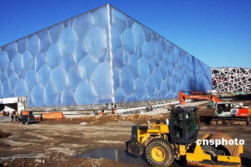 10月28日,北京國(guó)家游泳中心“水立方”工地,工人們正在緊張施工。據(jù)了解,陽(yáng)光下呈淡藍(lán)色的國(guó)家游泳中心“水立方”目前總體工程建設(shè)進(jìn)展順利,并將于2007年年底全部完工。中新社發(fā) 鄭雄增 攝