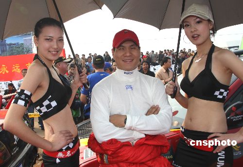 2007年國際汽聯(lián)亞太汽車拉力錦標賽11月9日在浙江龍游拉開戰(zhàn)幕,來自世界的眾多高手及中國的共計65部賽車參賽。圖為“中國第一車手”徐浪(中)新組建的“無名車隊”由美女相伴出戰(zhàn)。中新社發(fā) 趙振清 攝