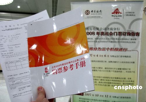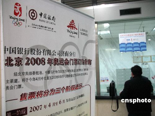 12月10日,濟(jì)南市民在中國銀行預(yù)定北京奧運門票。據(jù)銀行工作人員介紹,由于這一次預(yù)定需要抽簽,因此沒有出現(xiàn)上一次的搶購情景,體育愛好者們心情平靜,一天下來僅有數(shù)十人預(yù)定。 中新社發(fā) 周青先 攝