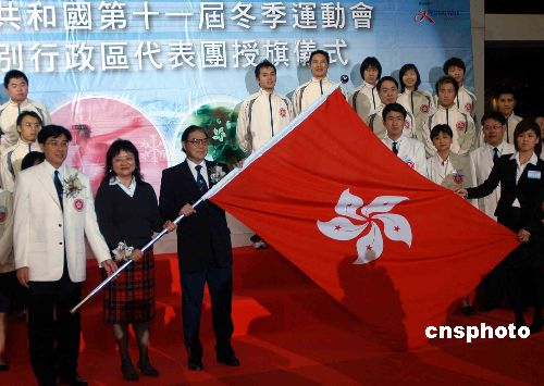 民政事務(wù)局常任秘書長(zhǎng)尤曾家麗(左二)授旗予代表團(tuán),香港特別行政區(qū)代表團(tuán)籌備委員會(huì)主席霍震霆(左三)和籌備委員會(huì)副主席、康樂(lè)及文化事務(wù)署署長(zhǎng)周達(dá)明(左)接旗。