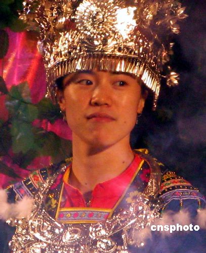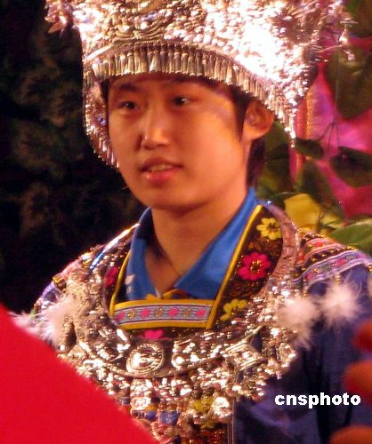 12月24日晚,2007年國(guó)際女子乒乓球?qū)官愒趶V西柳州拉開(kāi)帷幕。賽前所有運(yùn)動(dòng)員都身穿當(dāng)?shù)氐拿褡宸b亮相。中新社發(fā) 周瀟男 攝