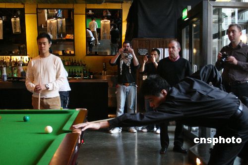 當(dāng)?shù)貢r(shí)間一月九日下午,中國“臺(tái)球神童”丁俊暉(擊球者)和香港名將傅家俊(穿白衣者)在倫敦唐人街的一間酒吧“過招”,推廣將在本月十三日開始的溫布利大師賽。中新社發(fā) 李鵬 攝