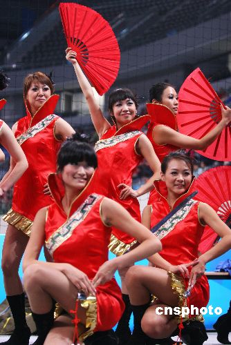 1月11日,“好運(yùn)北京”2008手球邀請賽在國家體育館落幕。圖為啦啦隊隊員活力四射的勁舞,為比賽添色不少。中新社發(fā) 富田 攝