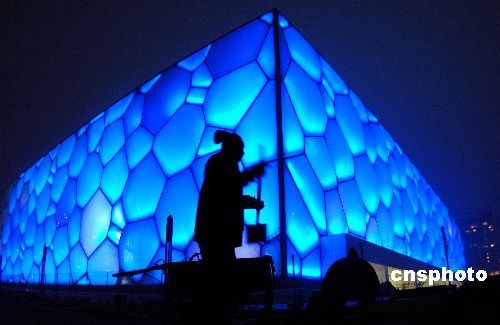 圖:北京“水立方”調(diào)試造型燈光